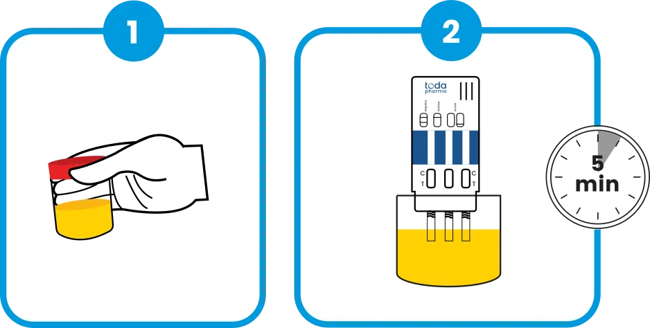 Toda Drugdiag® 3THC is an immunochromatographic test in dip cassette format for detecting different THC – cannabis concentration thresholds in urine. The test is based on a competitive method that identifies specific antibodies.